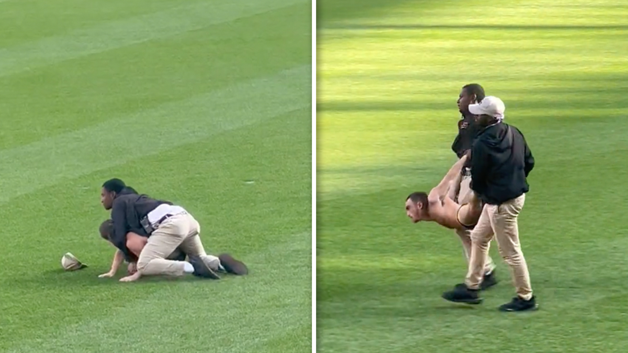 Someway, although, the person bought as much as his toes — which compelled safety to hurl him proper again to the grass like a WWE wrestler. Seconds later, one other guard got here in and helped carry the man to a close-by police officer, who put handcuffs on the person.